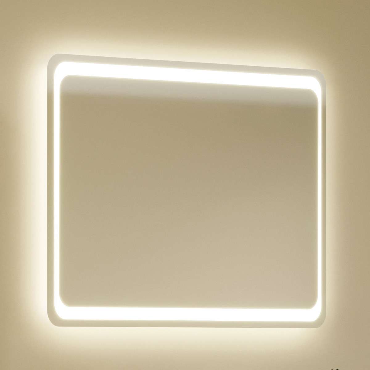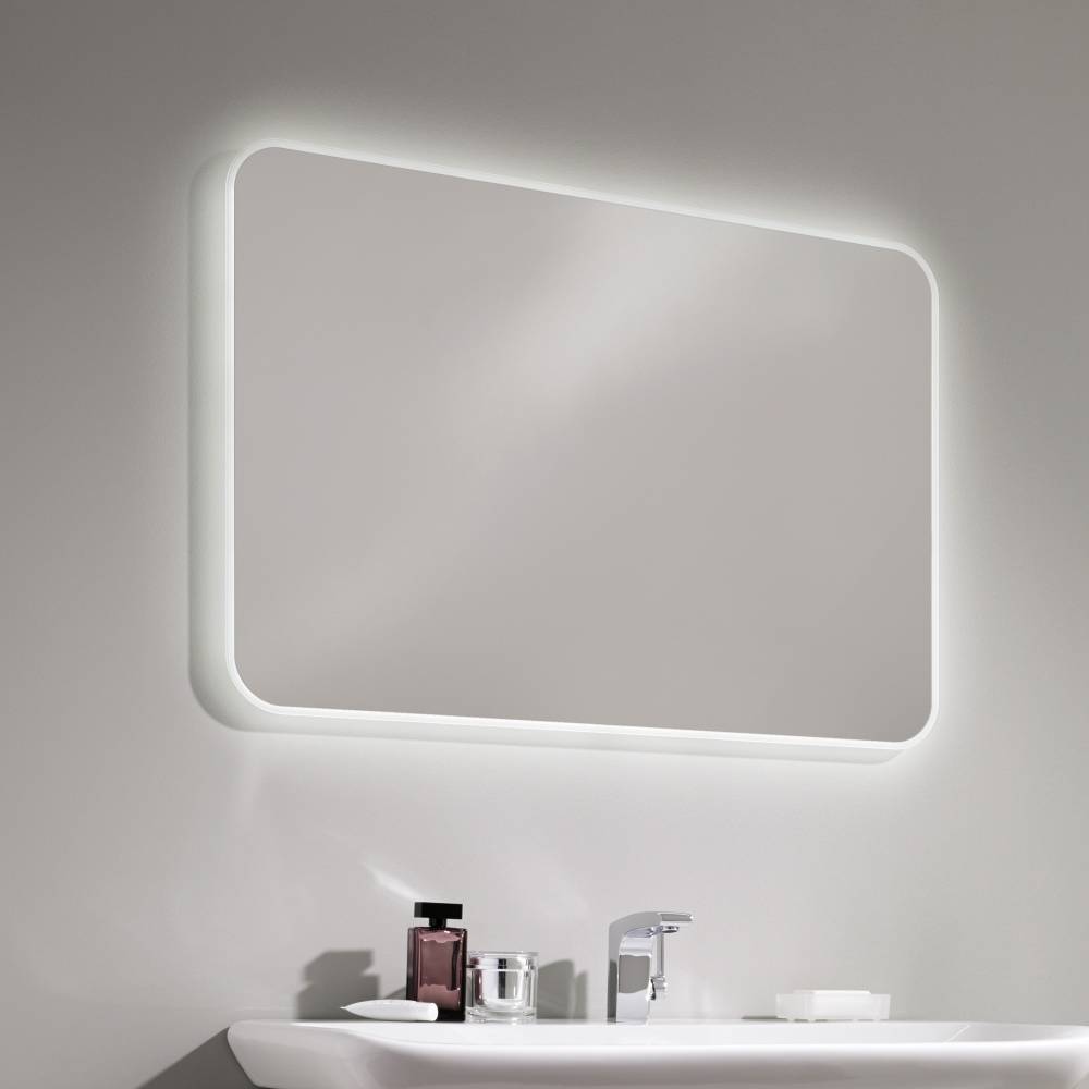 На фото современная ванная и прямоугольное зеркало со встроенной подсветкой на стене.