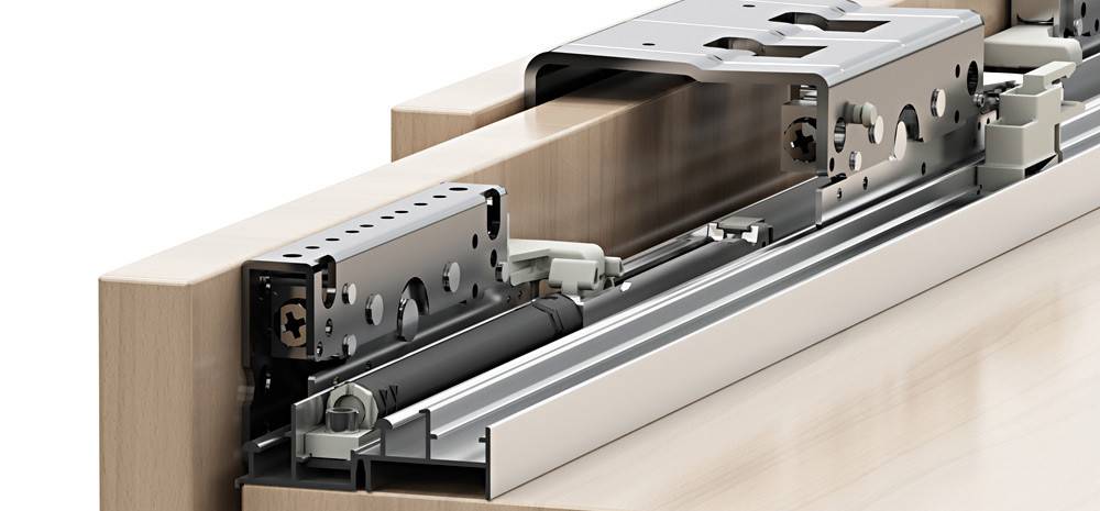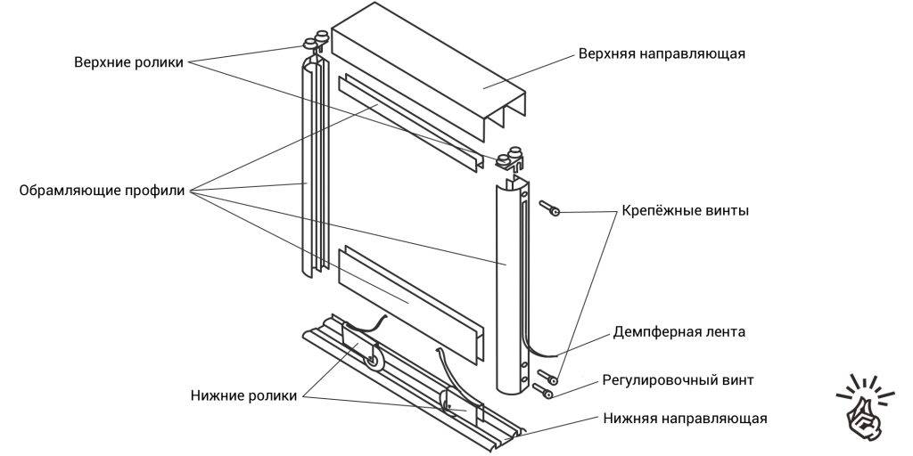 Дверцы снабжены направляющими рельсами из металлопрофиля. Они прикручиваются к полотнам шурупами, винтами, болтами. К верху и низу створок крепятся колесики. Большая часть механических нагрузок приходится на нижние ролики и рамку, зафиксированную в коробе конструкции. Они чаще всего выходят из строя и нуждаются в ремонте.