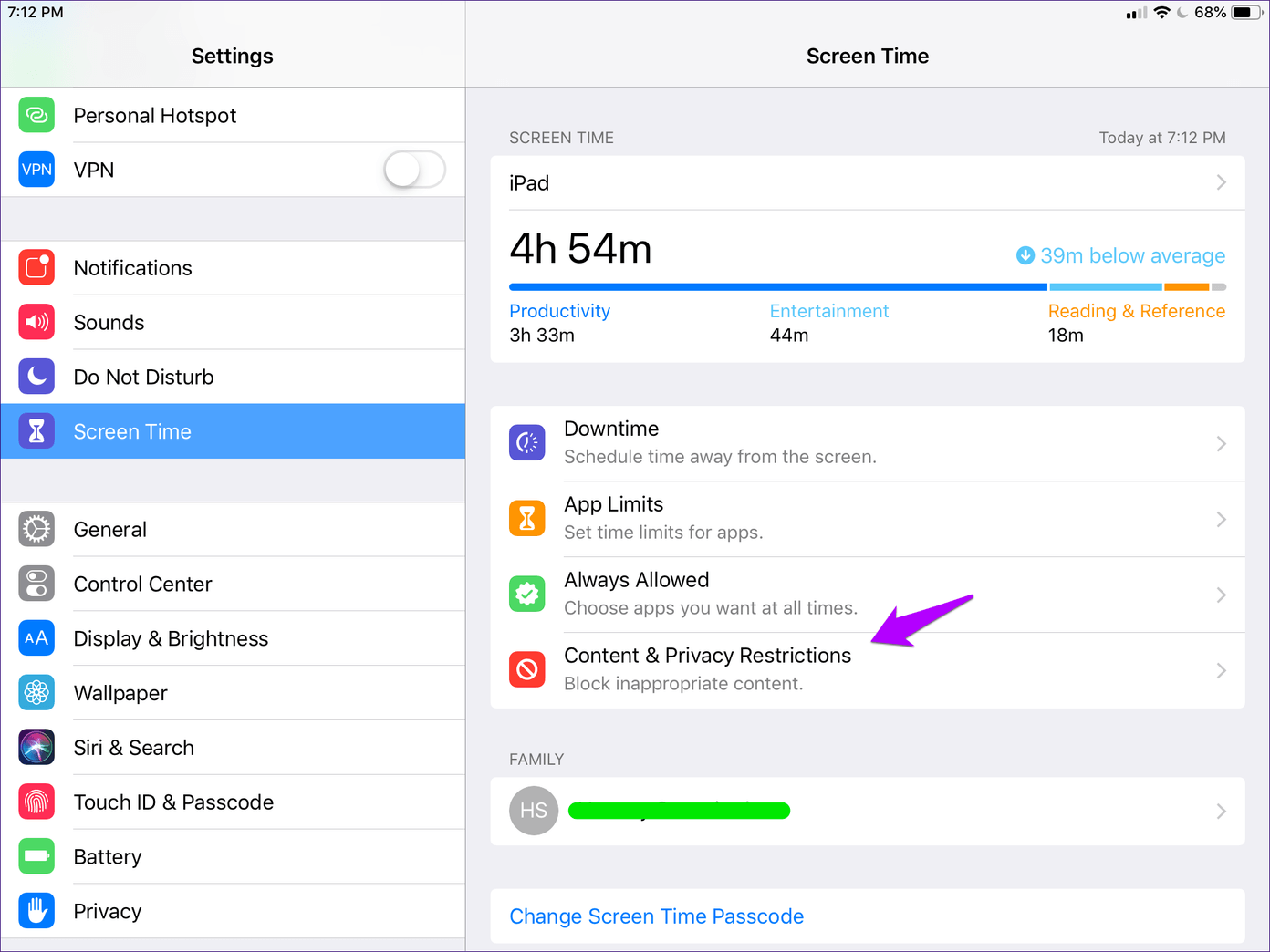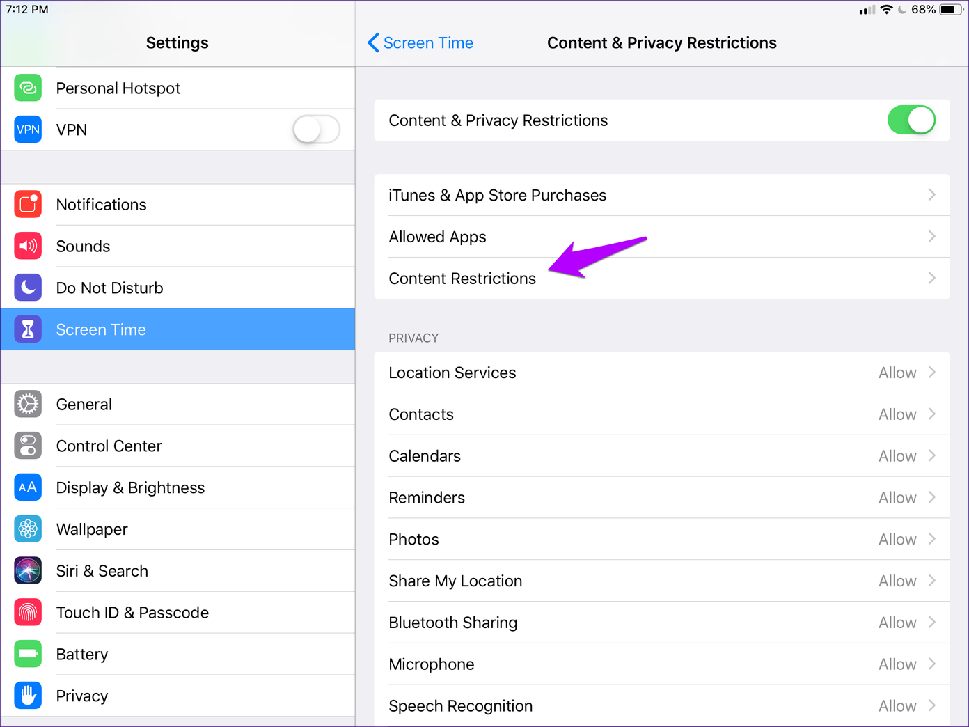 Шаг 1. Откройте приложение «Настройки» на вашем iPhone или iPad, нажмите «Время экрана», а затем нажмите «Ограничения содержимого и конфиденциальности».