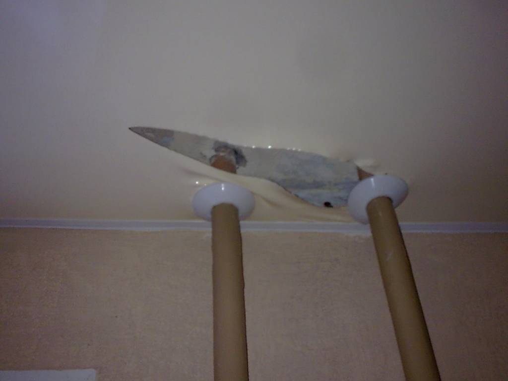 Значительное отверстие в натяжном потолке скрыть сложнее. Причины их возникновения могут быть те же, только из-за сильного натяжения пленки отверстие может легко расшириться. Иногда значительные дефекты появляются в процессе выноса габаритной мебели или при неосторожном обращении с бильярдным кием либо другими длинными и острыми предметами. Дать ответ на вопрос, можно ли заделать дырку в натяжном потолке в данном случае, сложно, потому что многое зависит от размеров повреждения и места его локализации.