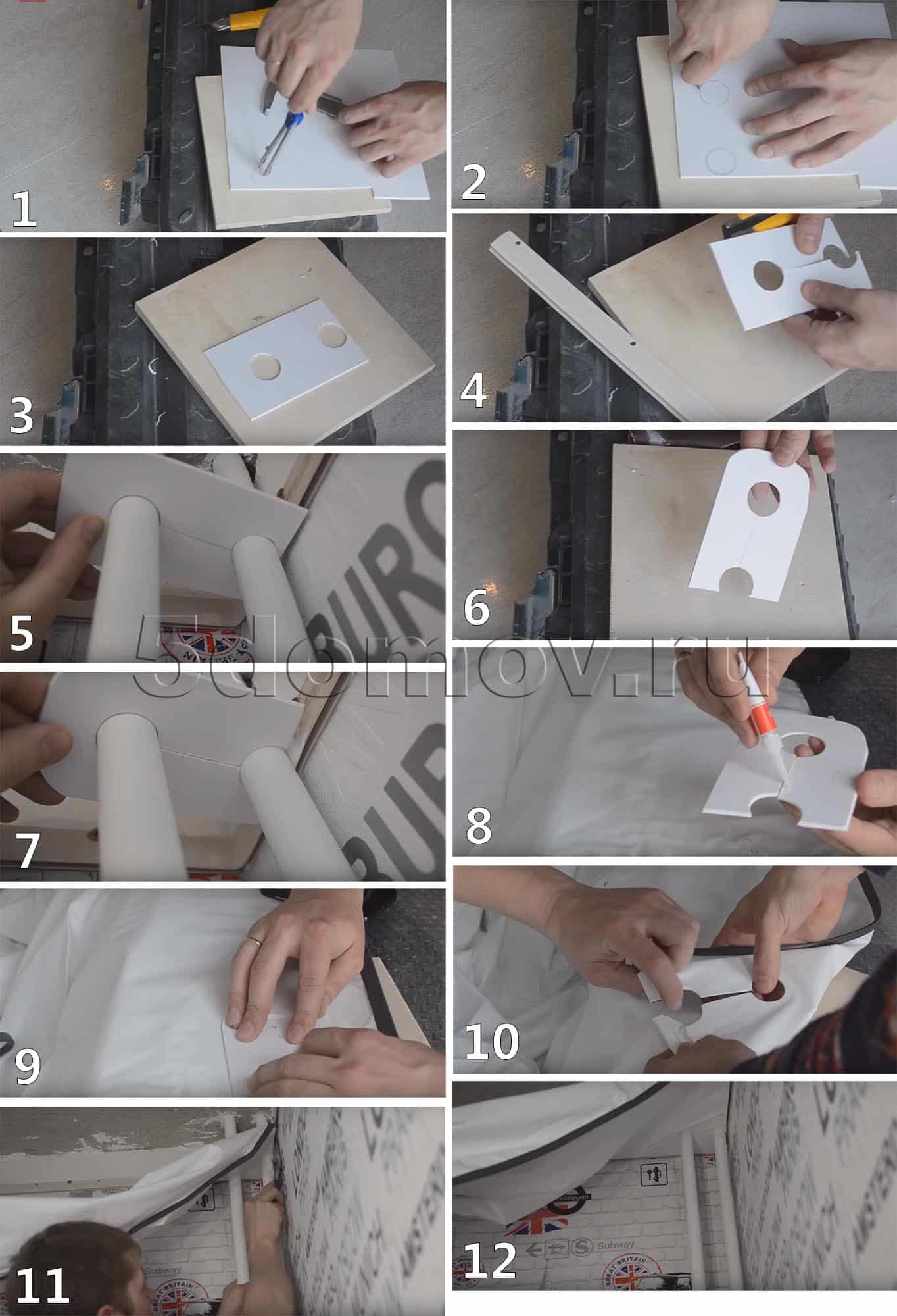 Используя нож, производят надрез пленки по очертанию подкладки, выполнив отверстие в крестообразной форме. Образовавшие треугольные края заправляют внутрь и садят на клей. Далее пленка и приклеенная накладка одевается поверх трубы. Вырезанную пластиковую «защелку» нужно зафиксировать поверх кольца, добившись одновременного закрепления гарпуна фрагментом материала. Заключительное натягивание пленки начинается от ближнего угла. Этот метод оформления дырки под стояк отопления подойдет только для ПВХ пленки.