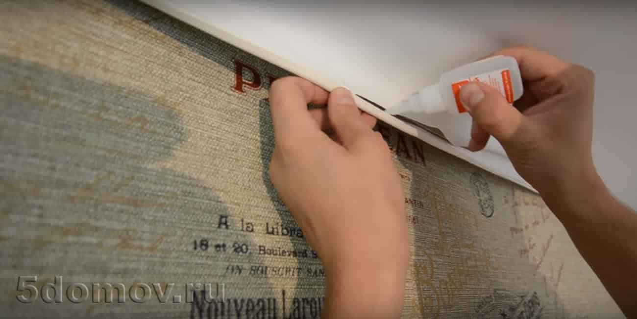 Ткань приклеивают любым прозрачным клеем (идеальным вариантом будет клей на основе цианоакрилата) с обратной стороны потолка и аккуратно разглаживают. Перед тем, как заклеить дырку, удостоверьтесь, что края тканевого полотна идеально прилегают к сделанной заплатке. Место ремонта следует окрасить максимально подходящей по цвету краской (смотрите как красить потолок).