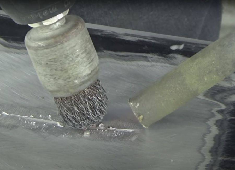 Для дополнительной очистки металла от пленки можно использовать механические методы. Это осуществляется с помощью мелкой металлической щетки. При растирании инструмент нагревается, что позволяет сразу снимать оксид и заменять его на припой. Таким образом на поверхности не образуется лишний налет, он попросту не успевает этого сделать.