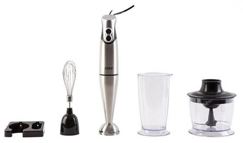 В комплекте с ручным блендером производитель может прилагать венчики, ножи и насадки для пюре