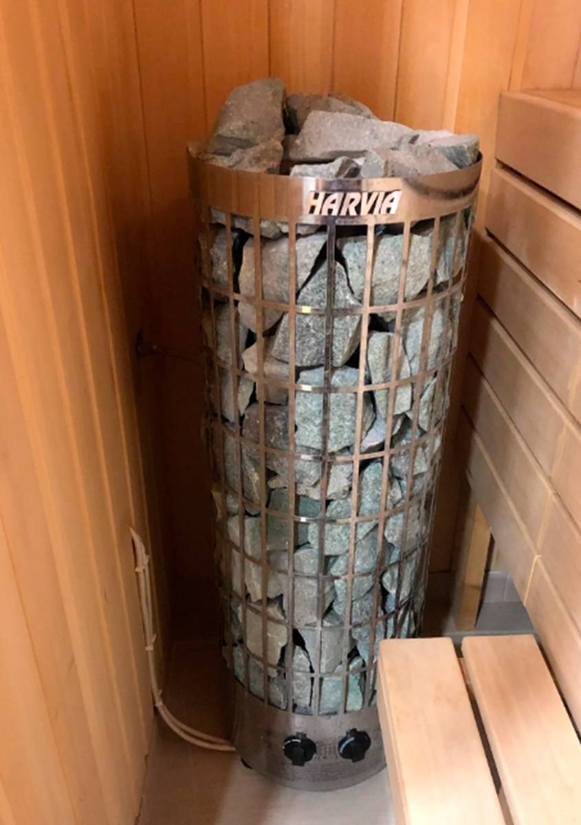 Еще одна печь от известной финской фирмы. Внешне выглядит как сетчатый цилиндр, заполненный камнями, с элементами управления на нижней части. Допускается монтаж в непосредственной близости от полок — поверхность печи не раскаляется до опасных состояний. Мощность печи — 6,8 кВт. Рассчитана на помещение 10 м3. Вес каменки — 90 кг.
