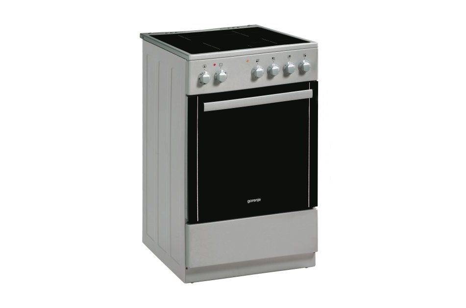 Компактная электроплита 0,5 метра в ширину с электрическим духовым шкафом. Имеет термостат, режим гриля, подсветку. Варочная панель также оснащена индикаторами остаточного тепла. В остальном функционал традиционный: управляется поворотными переключателями, чистка происходит вручную.