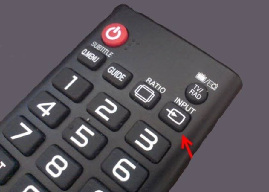 - На телевизоре выберите источник сигнала. Чтобы это сделать, на пульте управления нажмите кнопку «Input» или «Source», укажите порт, к которому вы подключили шнур.
