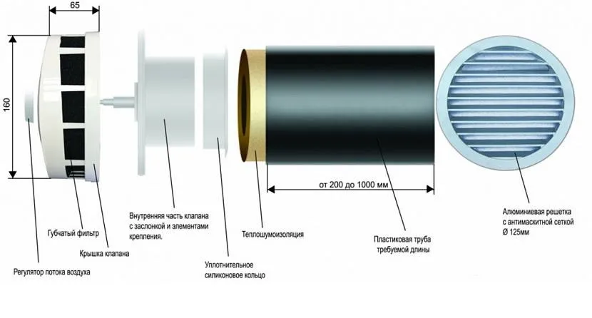 Каждый клапан подобного типа имеет свое универсальное строение. Работа клапана считается эффективной только в том случае, если он пропускает до 30 кубический метров воздуха за 60 минут. Чтобы это осуществлялось, устройство обязательно должно иметь следующее строение: