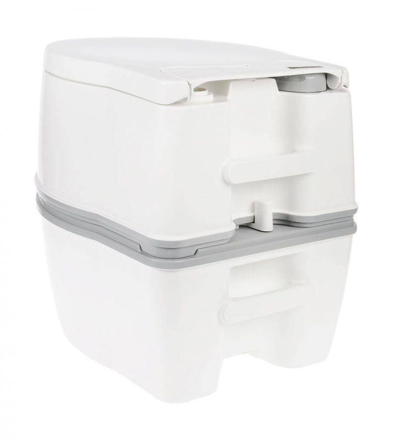 Корпус этого портативного туалета производитель выполнил из прочного пластика, способного выдерживать нагрузки до 150 кг. В конструкции модели предусмотрен индикатор. Он подает сигнал о наполнении нижнего бака. Опорожнять его также довольно легко. Для этого на нижней емкости имеется сливной патрубок, который можно повернуть без особого труда. Подобная деталь способствует тому, что у хозяев нет необходимости в очистке каждого элемента. Помимо этого, пользователи отмечают и еще одну полезную функцию данной модели. В ее конструкции предусмотрена кнопка сброса давления. Она позволяет предотвратить разбрызгивание содержимого при опорожнении.