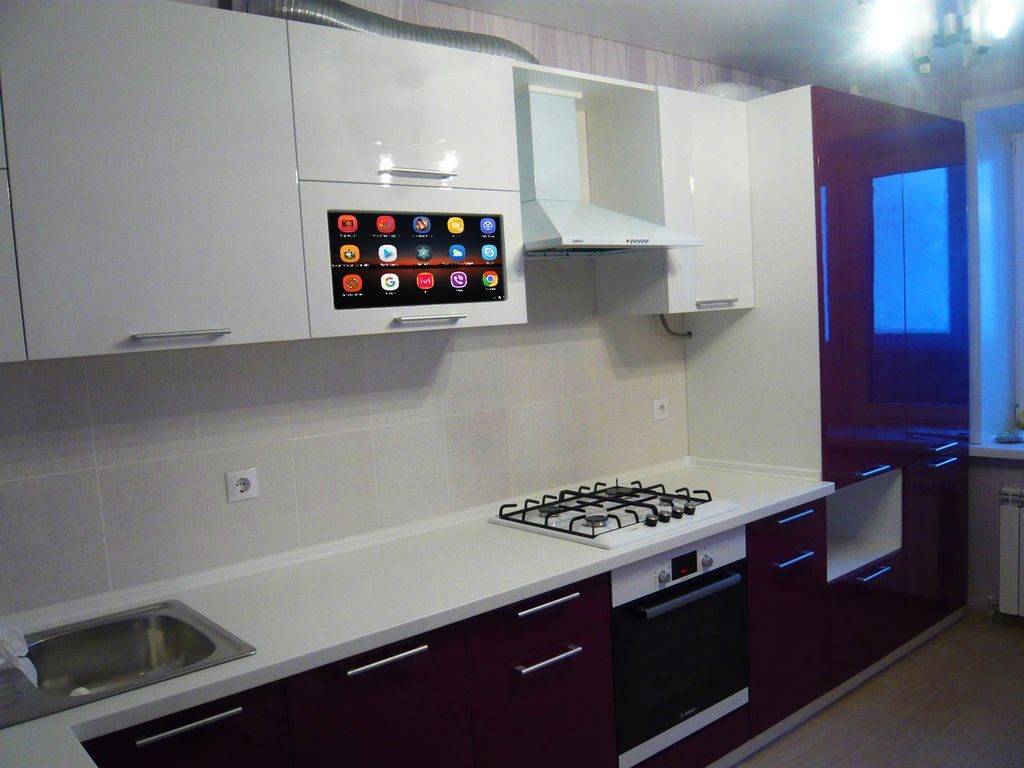 ТВ, встроенный во фронт мебели устанавливается в любой передней стенке кухонного шкафа. Такой вариант имеет 17-дюймовый сенсорный экран, панель управления, металлический корпус. Стоит встраиваемая модель довольно дорого. Модели часто дополнительно оснащены DVD-плеером, USB.
