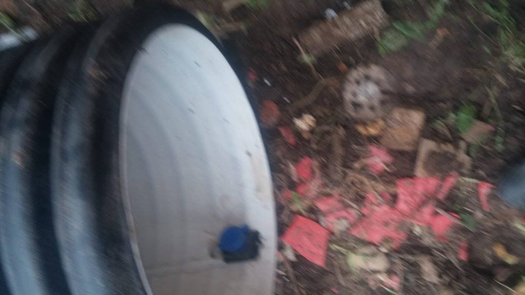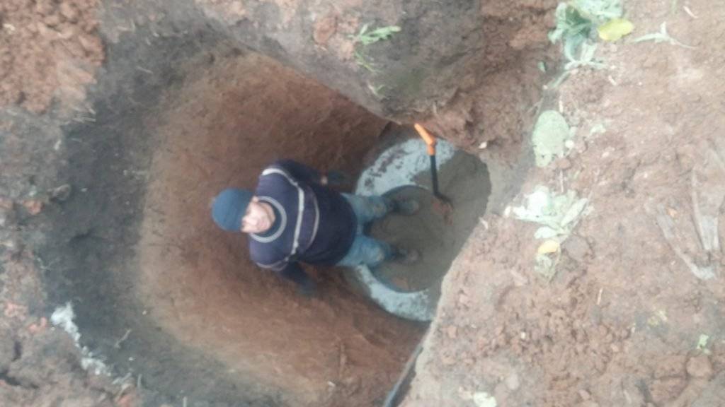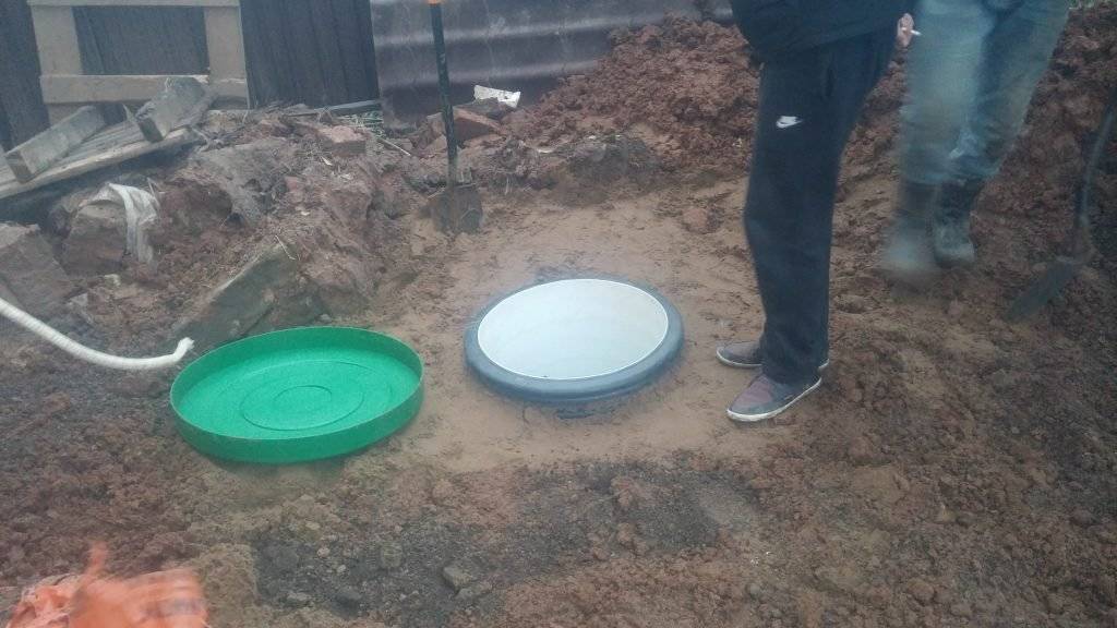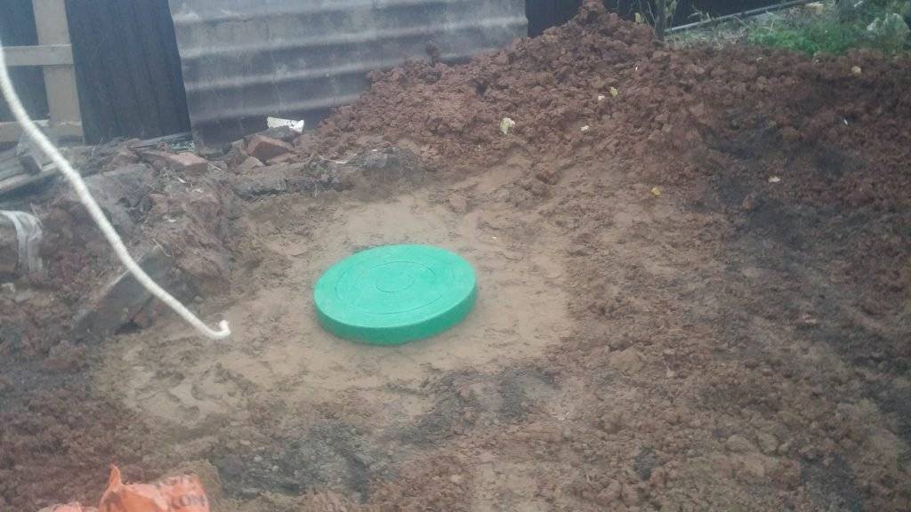 Хороша туба еще тем, что она легкая так как состоит только из пластика, мы легко опустили ее и установили на место. Далее с помощью троса туба была надежно закреплена к жб плите. Теперь можно заводить отводящую трубу (ПНД 32) и начинать закапывать.