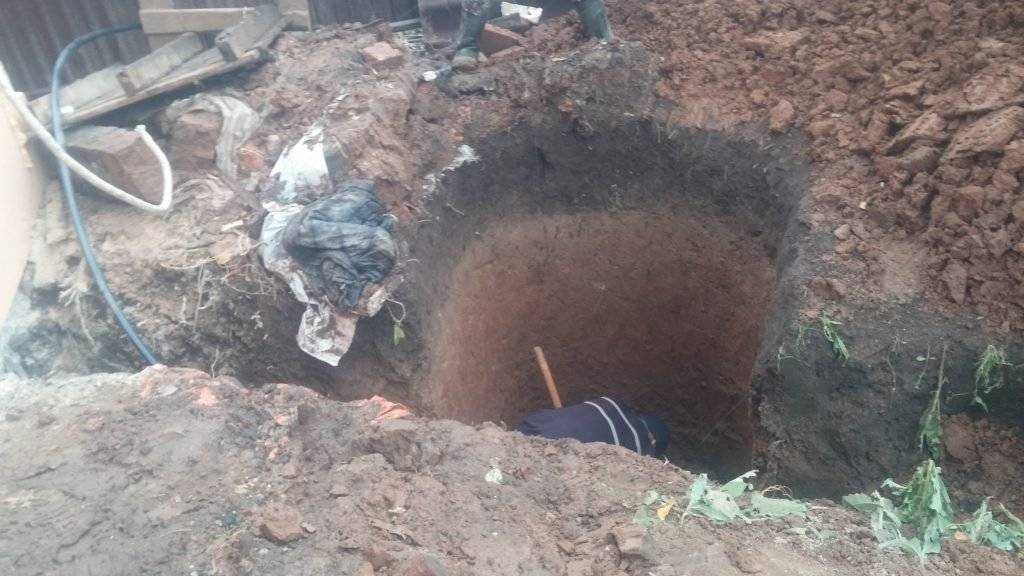 Отводящая труба уже в траншее и выведена в центральную канализацию, оставалось соединить ее со станцией. Копаем котлован для установки канализационной насосной санции.