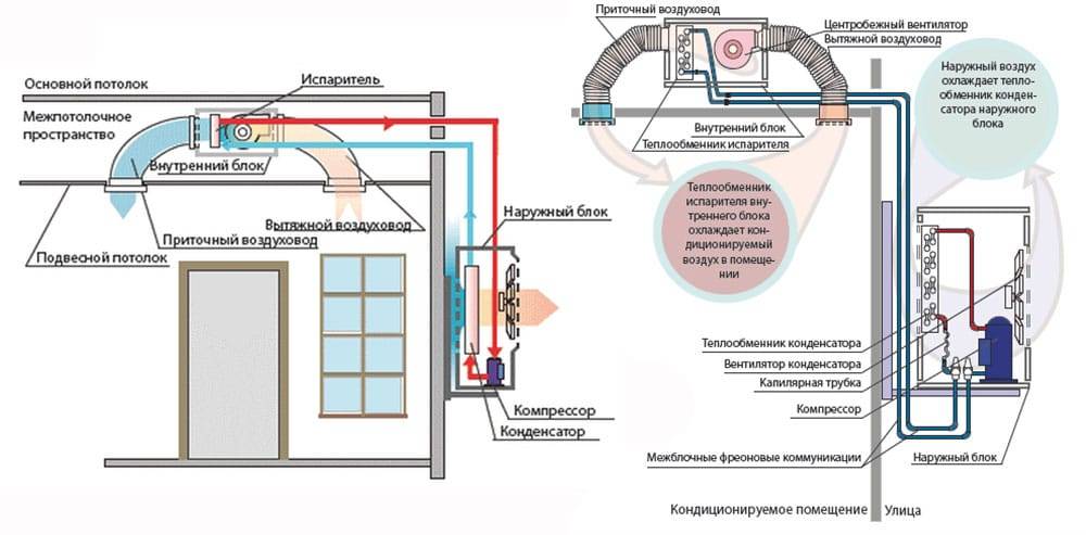 Особенностью работы сплит-системы канального типа, как и прочего климатического оборудования, является удаление тепла из обслуживаемого помещения с последующим его переносом за пределы строения. По своей сути принцип работы канального кондиционера мало чем отличается от функционирования прочего холодильного оборудования. Так, движение хладагента, его переход из газообразного состояния в жидкое происходит посредством двух узлов: испарителя и конденсатора. Внутренний блок содержит в себе узел испарителя, а конденсатор является частью внешнего устройства.
