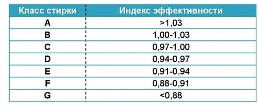 Применительно к стиральным машинкам используют классификацию от «А» до «G». Что это означает видно в таблице.