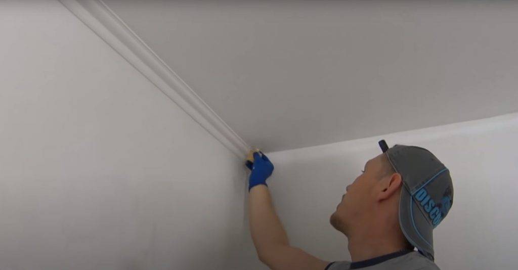 - Прижимают плинтус из пенопласта на потолок к стене, ждут столько, сколько указано по инструкции;