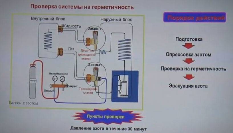 Производится вакуумирование, система наполняется фреоном и тестируется.
