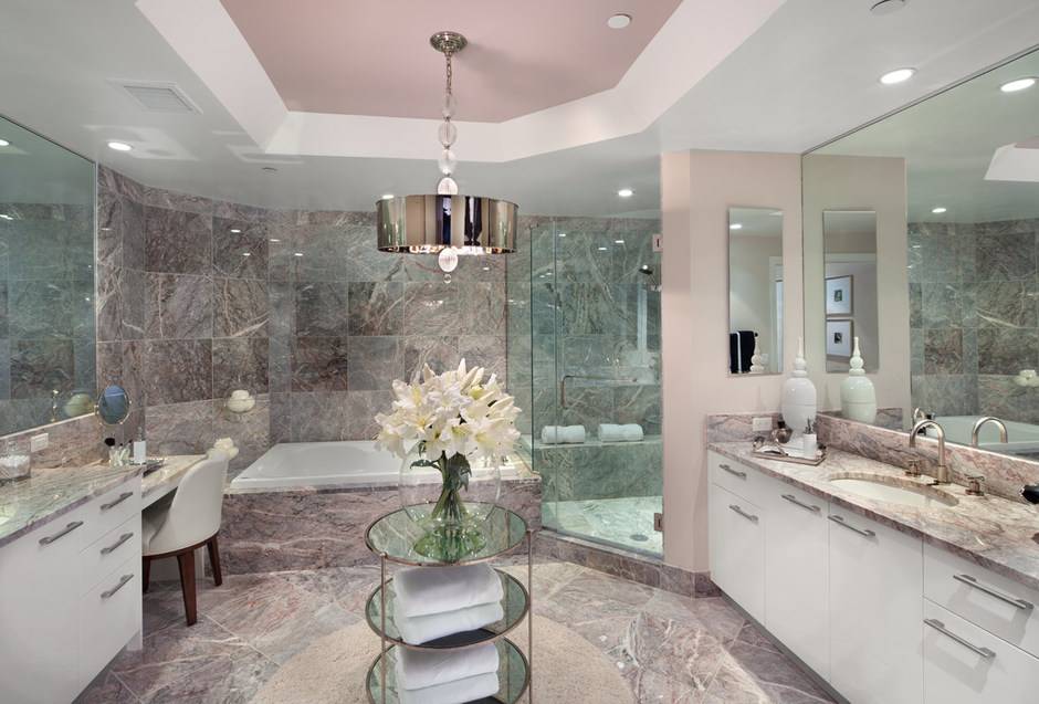 Еще одна ванна, которая точно понравится женской аудитории блога. Во-первых, она просторная, во-вторых, в ней много мест для хранения, а в-третьих, здесь есть столик для того, чтобы приводить себя в порядок— чем не мечта?