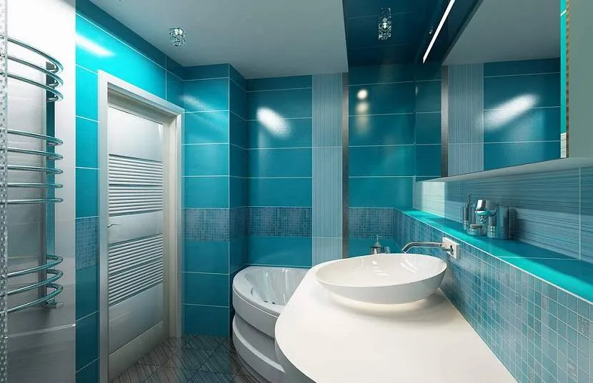 - Неудачную геометрию ванной можно исправить, комбинируя темные и светлые оттенки синего. Темный – снизу, светлый – в верхней части стен, на потолке. По центру узких стен можно пустить «бордюр» из аквамариновой плитки.
