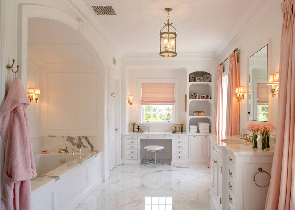 Очаровательная комната в бело-розовых тонах понравилась нам тем, что для ванны в стене создано специальное углубление: оно создает камерную атмосферу. А два окна обеспечивают приятный естественный свет.