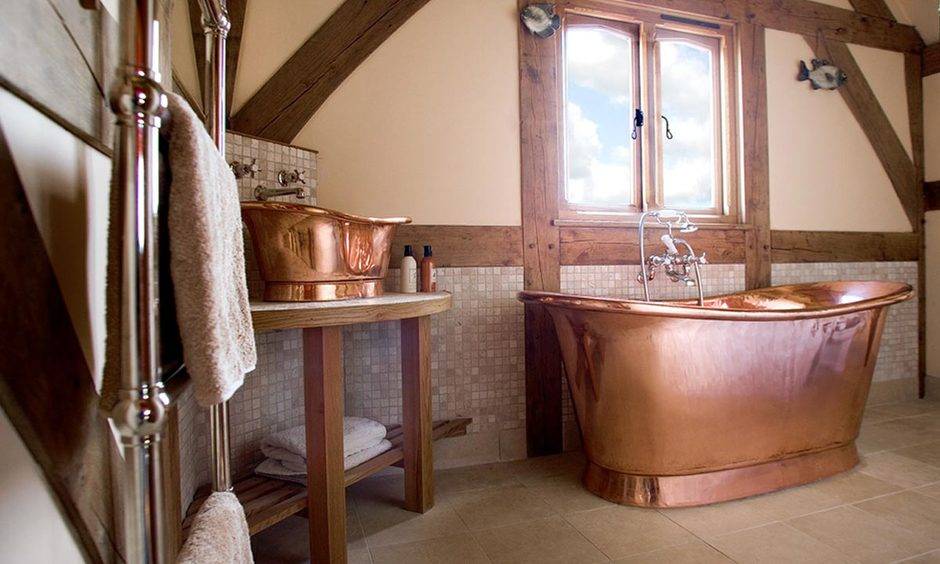 Смелая латунная ванна способна создать неповторимую атмосферу. Такой экземпляр интересно дополнит эко-стиль или ар-деко.