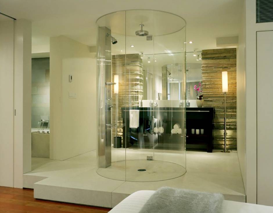 Этот необыкновенный душ напоминает микроволновой сканер в аэропорту, в котором нужно стоять с поднятыми руками. Несмотря на такую забавную ассоциацию, выглядит эта конструкция очень стильно. Судя по краешку кровати, этот душ еще и может запросто послужить открытой сценой…