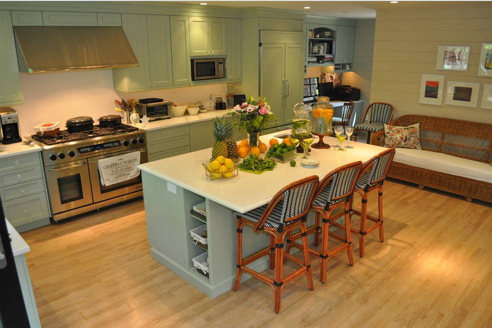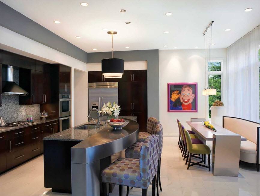 В просторной кухне, особенно это касается совмещенных помещений, в которых кухонная зона соседствует с гостиной, диван можно использовать и как зонирующий элемент, расположив этот предмет мебели в центре комнаты. Часто такое расположение совпадает с установкой кухонного острова, и задняя часть дивана совмещается с фасадом этого обособленного модуля.