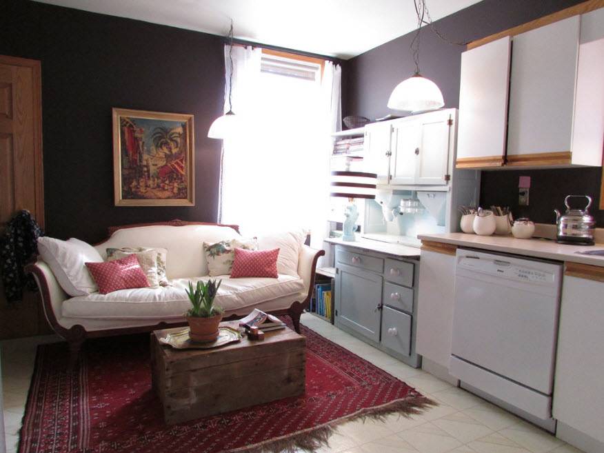 Кухню со спальным местом можно обустроить не только диваном-кроватью, но и односпальной кушеткой, софой или тахтой, на которой можно спать, отдыхать и сидеть за столом.