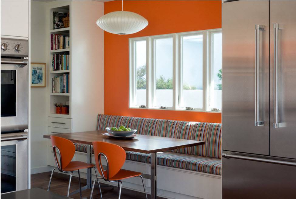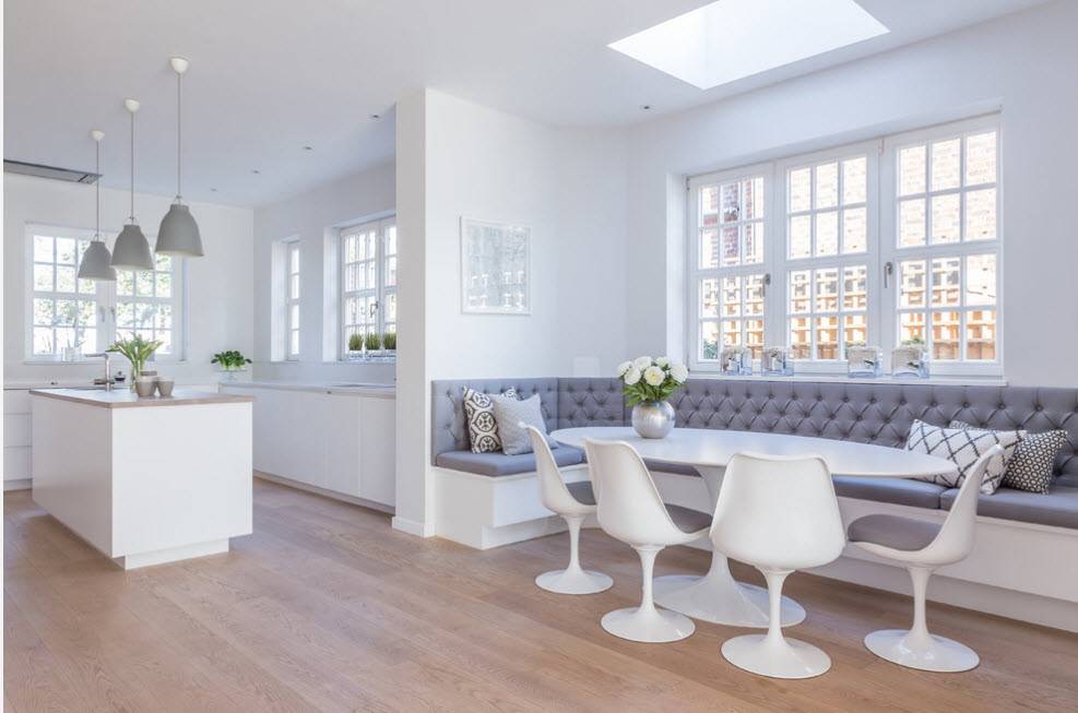 Ниша под зону столовой может быть создана и намеренно, с целью зонирования. В этом случае диванчик часто тоже является стационарным или, по-другому говоря, встроенным.
