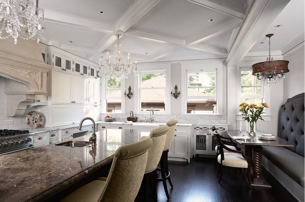 Если же вы делаете ставку не на функциональность, а на красивый дизайн, то традиционный угловой диван для кухни может заменить скамья, очень похожая на садовую лавочку. Она не имеет секции для хранения, но зато органично вписывается в интерьеры кухонь в классическом или деревенском стиле.