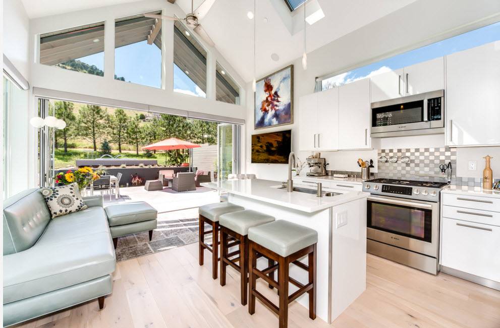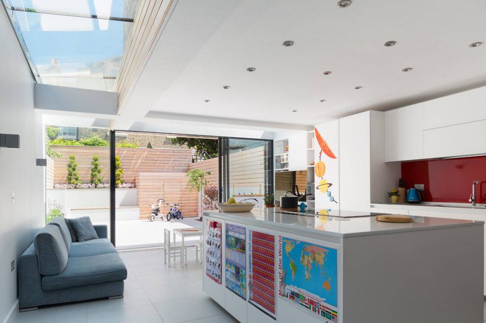 Размещение прямого светлого раскладного дивана в интерьере просторной светлой кухни
