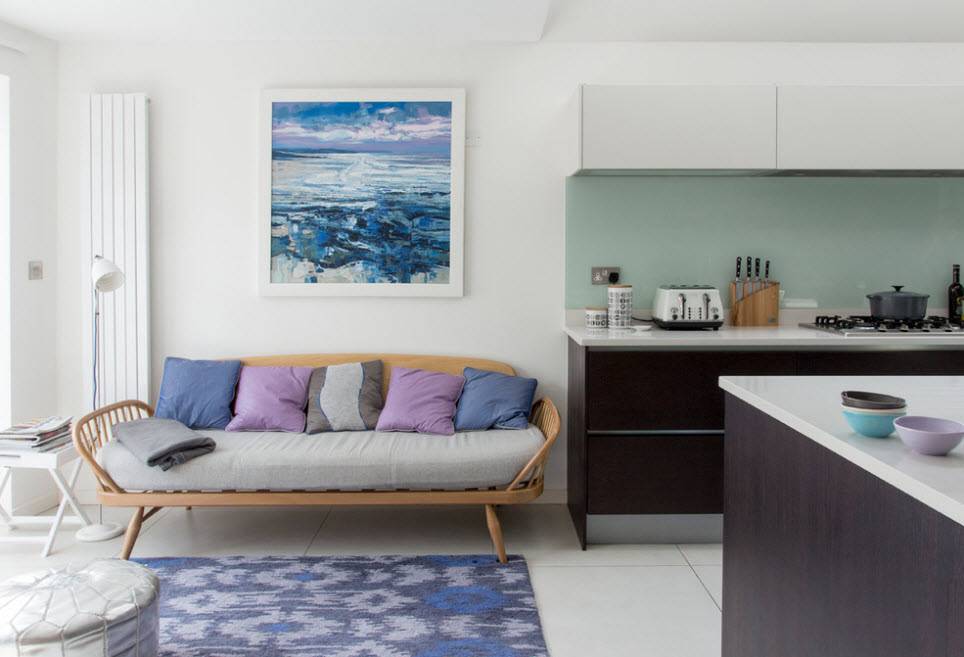 Второй вариант установки дивана в кухне – отдельно от обеденной группы, у стены. Диван используется исключительно как место для отдыха (может также использоваться для обустройства сальной зоны) и у стены устанавливается для того, чтобы занимать как можно меньше свободного пространства кухни.
