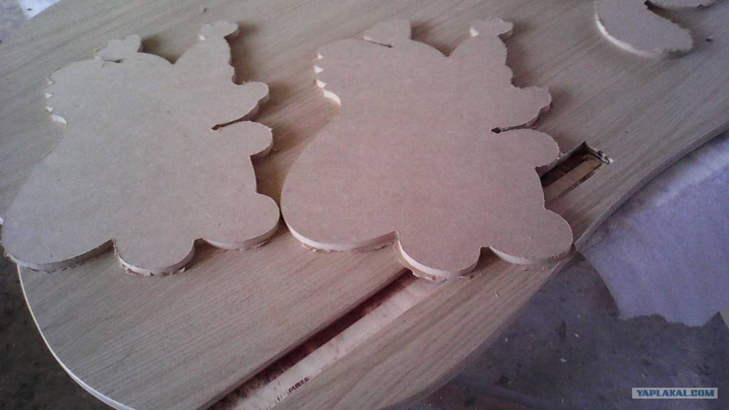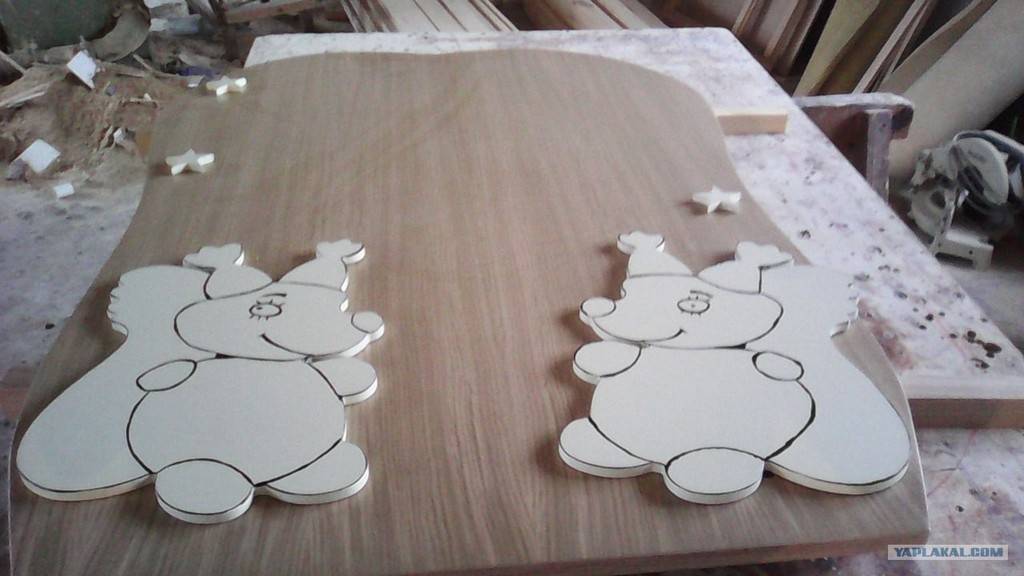 В данном проекте имеются и накладные детали — их прорисовываем отдельно. Когда все готово, берем лобзик и выпиливаем по контурам.