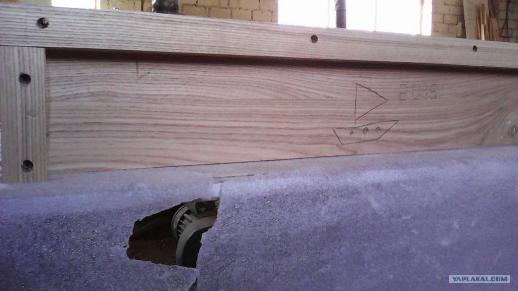 Берём две доски 5*10 см по длине матраса, на саморезы и клей закрепляем планку, которая короче на 10 см. Ближе к краю высверливаем отверстия. Шляпки должны быть в итоге полностью спрятаны.