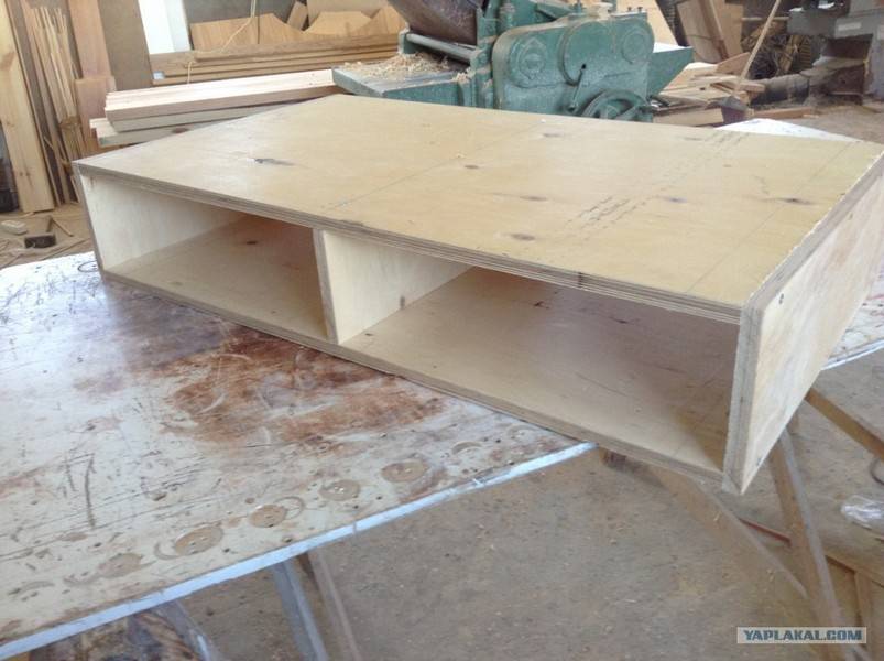 - Изготовление ящика для белья. Из доски вырезать 2 боковины длиной 78 см, заднюю часть длиной 150 см. Лицевую часть вырезать из доски шириной 20 см длиной 155 см, прикрепить две ручки для удобства вытягивания ящика. Соединить их в коробку, вырезать основание из фанеры, прикрепить к коробке. По углам зафиксировать мебельные колесики.