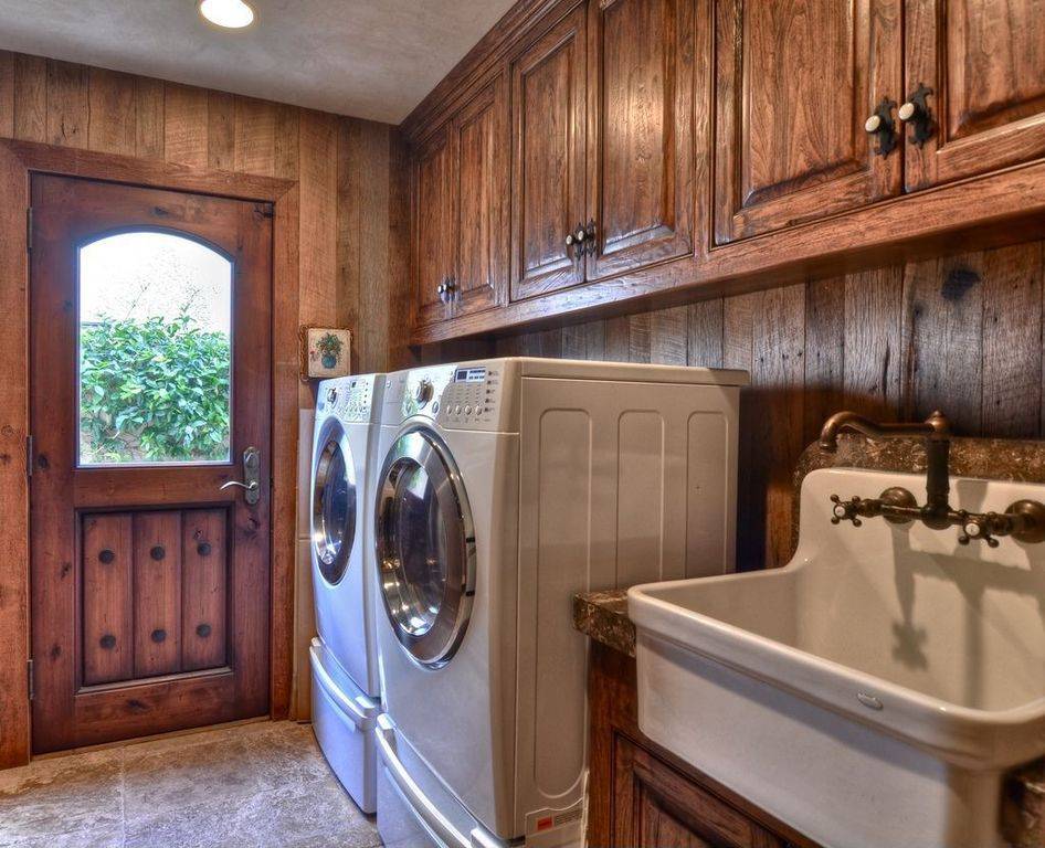 В большой семье и стирки больше. Вместо того чтобы искать машины с огромными барабанами, автор дизайна на фото ниже купил две и вставил их в нишу под шкафами. Получилось эффективное использование вертикального пространства. Главное, чтобы сушка была без вибраций и ничего не упало.