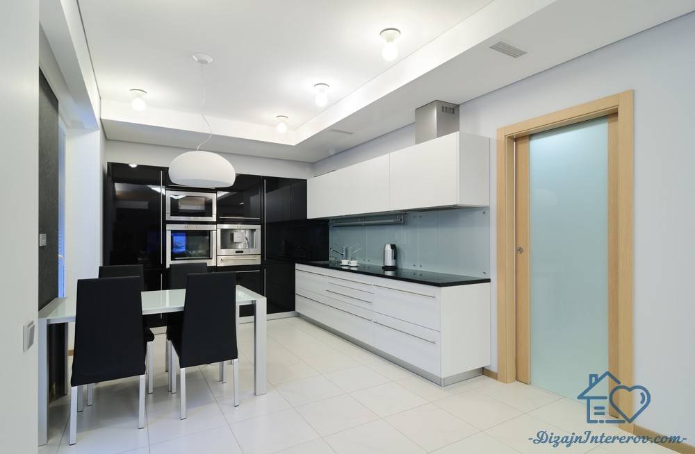 Потолок должен быть светлым, лучше матовым, но уместен и глянец. Он может быть покрыт штукатуркой или краской, оптимален натяжной потолок, а если высота позволяет, то кухню-гостиную лучше разграничить гипсокартонным двухуровневым потолком. Ниже — фото (листайте вправо).