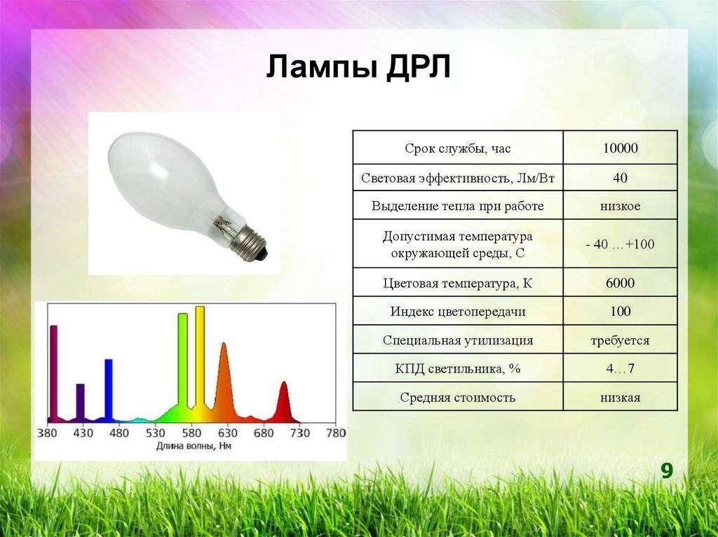Лампы ДРЛ имеют высокую световую отдачу и меньший светопоток при длительном сроке работы. Из-за отклонения эксплуатационных условий резко сокращается срок службы источников и уменьшается световая отдача. Также на срок работы влияет тот факт, какие используются импульсные запускающие устройства.