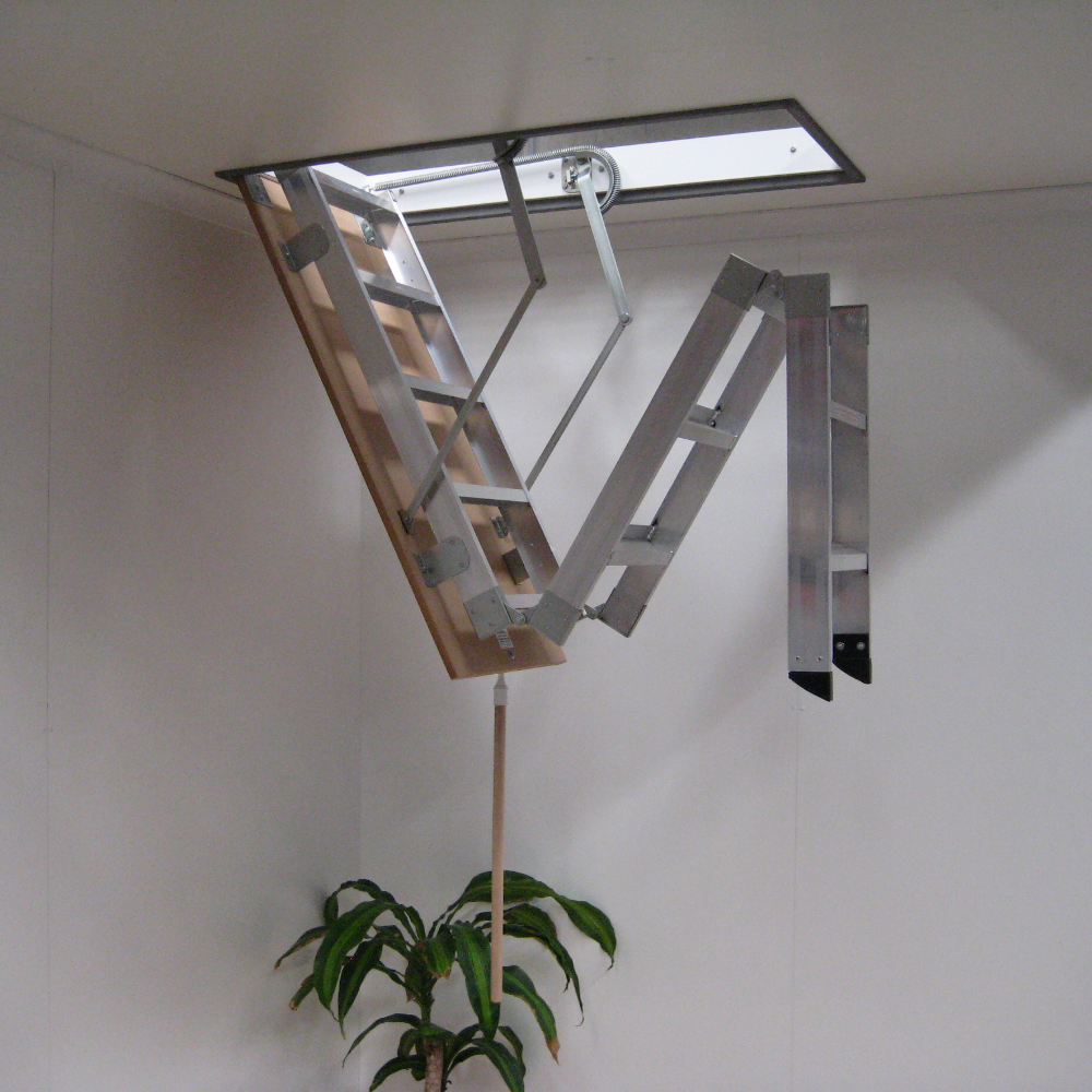 Также стоит выделить раздвижные лестницы. Это просто невероятное изобретение и удобное решение одновременно. Такая конструкция раскладывается одним движением руки, люк на потолке может быть гораздо меньше. Лестница представляет собой некое подобие гармошки, механизм при необходимости растягивается и создаёт подъём на верхний этаж. Затем нужно конструкцию поднять вверх и сверху закрыть люком. В отличие от складных, раздвижные лестницы очень компактны. Изготавливают их только из металла, поэтому такое удовольствие может стоить достаточно дорого. Но оно того стоит!