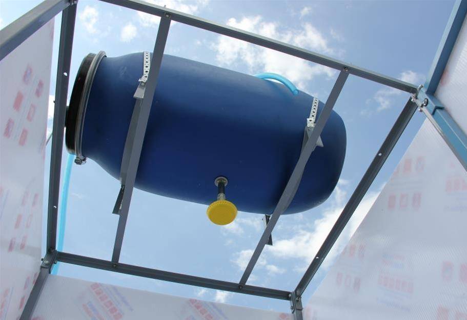 На ранее сооруженный каркас устанавливают накопительный бак. Его закрепляют стальной проволокой на верхней горизонтальной обвязке. В днище делают отверстие диаметром 15 мм, к которому подсоединяют патрубок длиной 300 мм с двухсторонней резьбой. Патрубок пропускают через отверстие в крыше кабинки. На его нижний конец накручивают запорную арматуру и лейку.