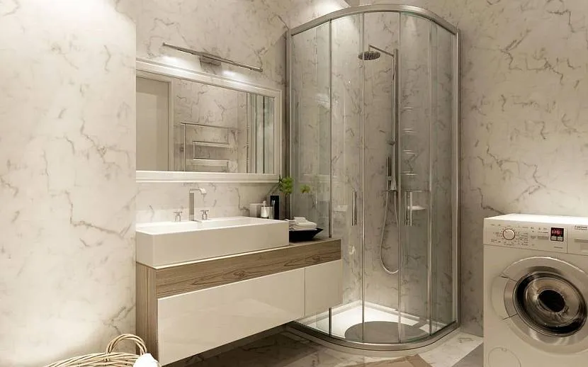 Важным фактором является выбор цветовой гаммы отделочных материалов. Для оформления маленькой ванной стоит выбирать светлые оттенки, они помогут сделать пространство более просторным. Темные цвета делают интерьер тяжелым, на них более заметны следы от капель воды. Преимущественно белый дизайн можно дополнить яркими акцентами, например, небольшими полками или цветным декором.