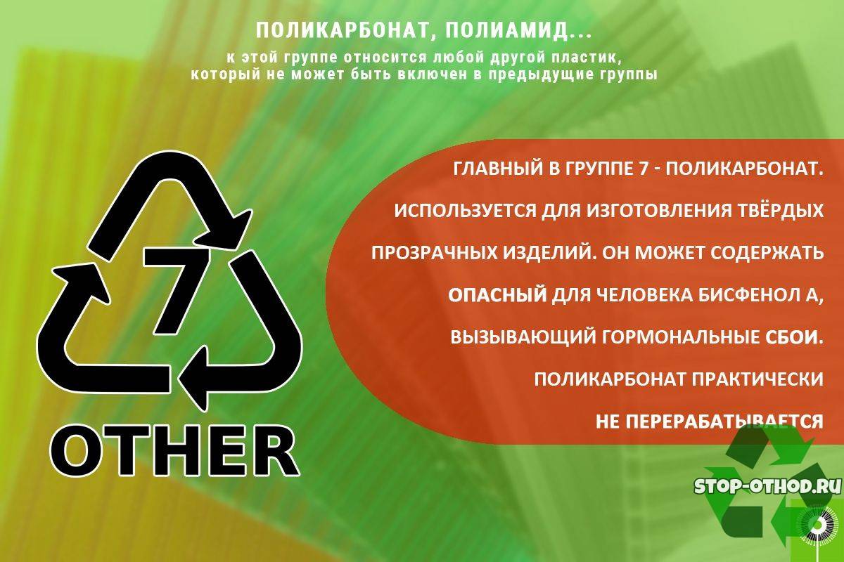 Отметка 7 или OTHER встречается на смесях полимеров, которые нельзя переработать и нагревать. Из них делают: