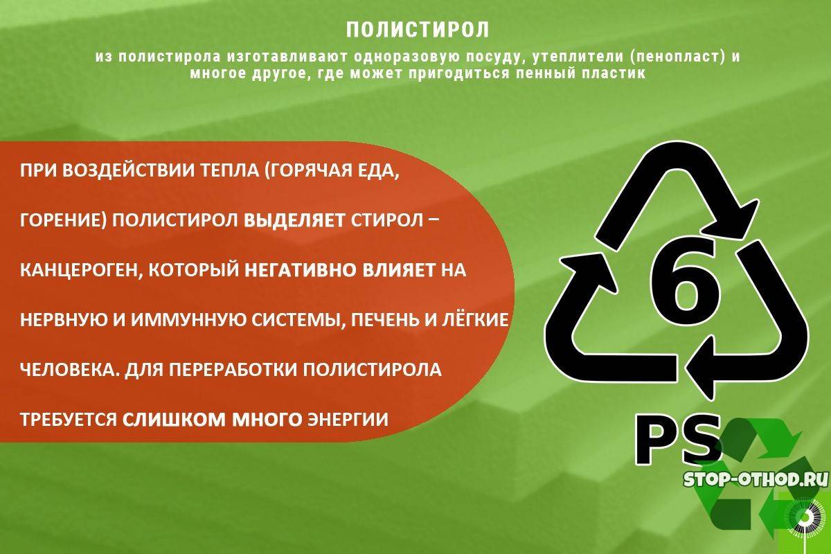 Цифра 6 на пищевой пластмассе, то только в качестве подложки или короба для фруктов. Также применяют для теплоизоляции.