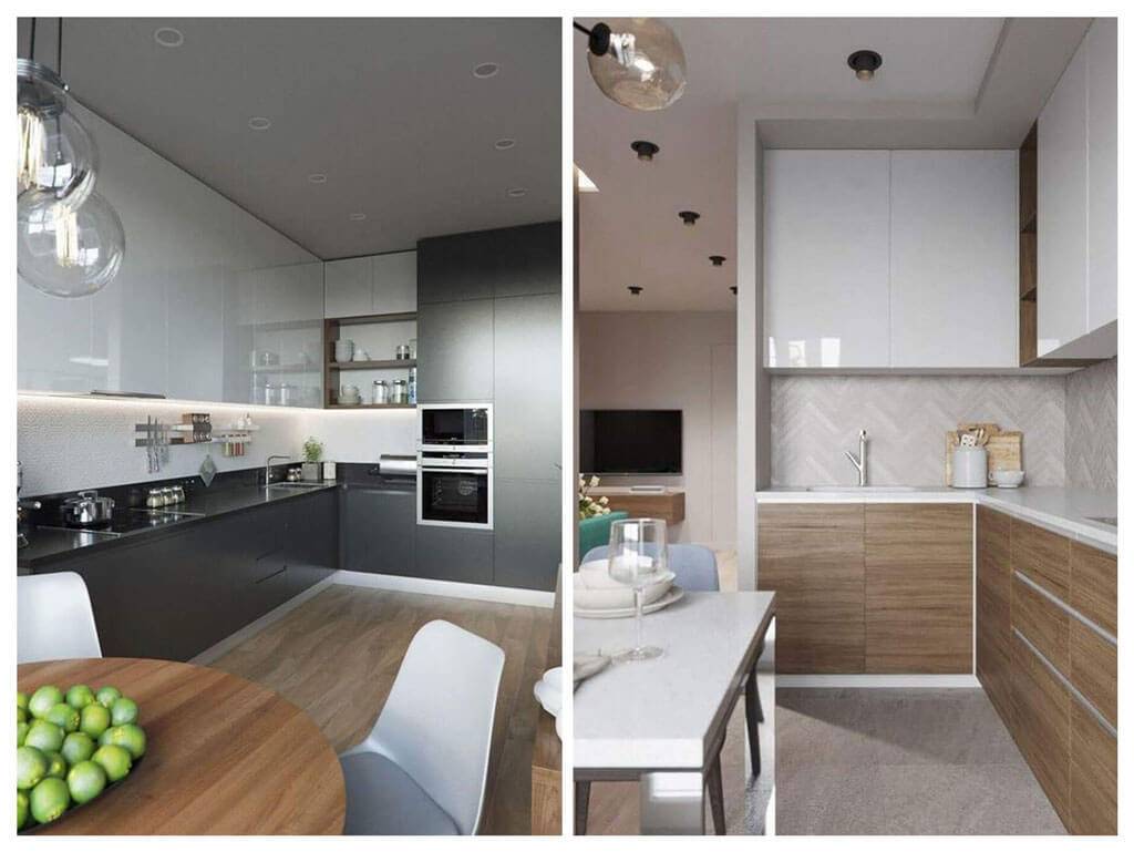 Маленькие кухни к планировке имеют более жёсткие требования. Для лучшего комфорта подбирайте шкафчики с раздвижными дверками и постарайтесь рационально использовать все пространство. К примеру, в зазоре между холодильником и рабочим столом можно установить выдвижной узкий шкаф для бутылок. В большую кухню можно выбрать гарнитур с распашными и выдвижными шкафами.
