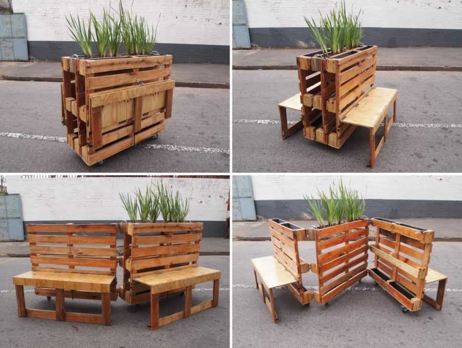 В дополнение к скамейке из поддонов делают столы или кресла. Если же составить несколько скамеек вместе, расположив их под прямым углом, то получится неплохая зона для проведения бесед, мастер-классов, да просто веселых посиделок. Существуют варианты, при которых скамейки разделяют высокой спинкой, устанавливают в барах, кафе.