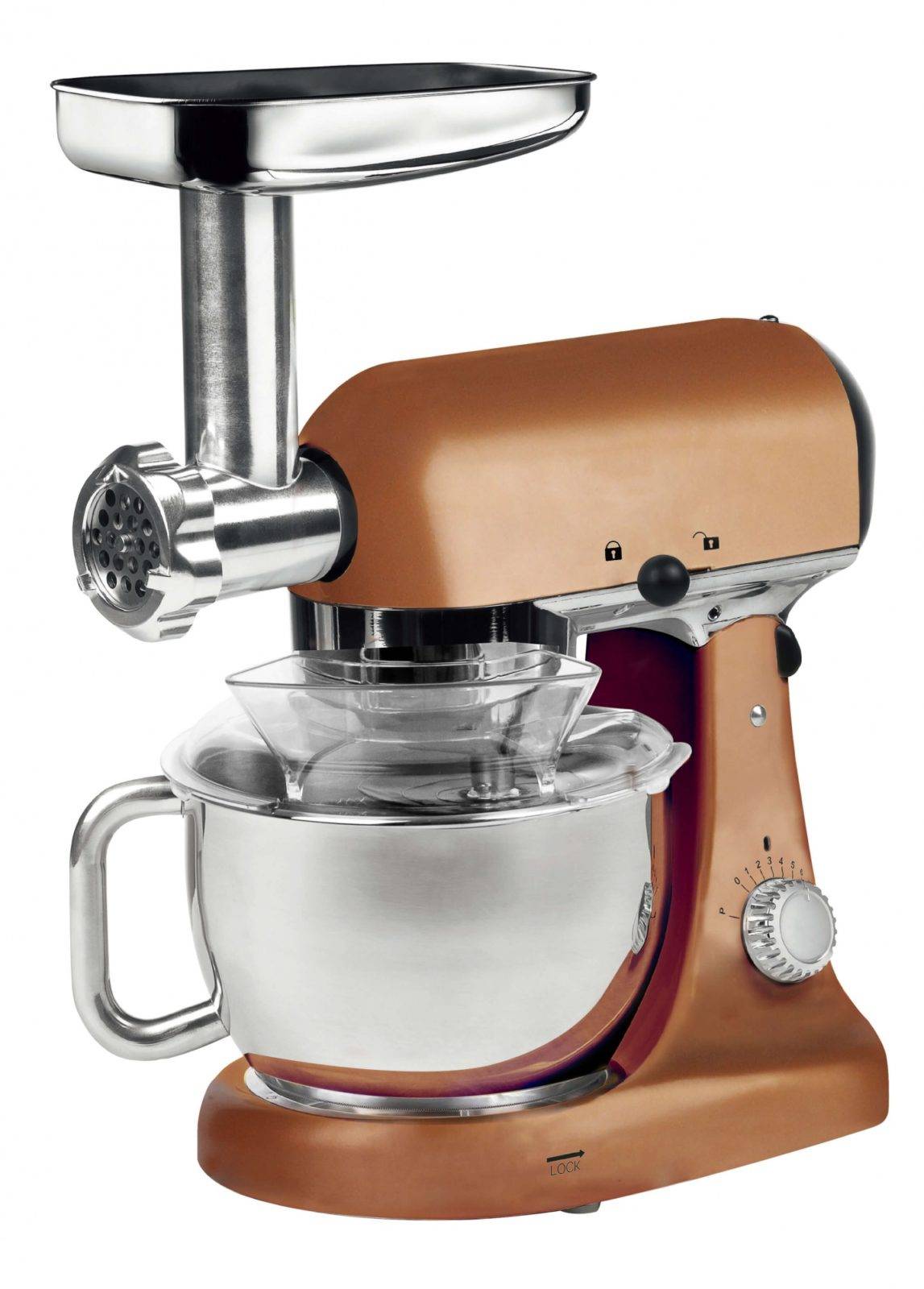 Недорогое устройство планетарного типа обладает емкостью 6 л из прочной стали. Поддерживает восемь встроенных скоростей с механической регулировкой, есть импульсный режим. В наборе производитель предлагает три насадки с простой заменой.