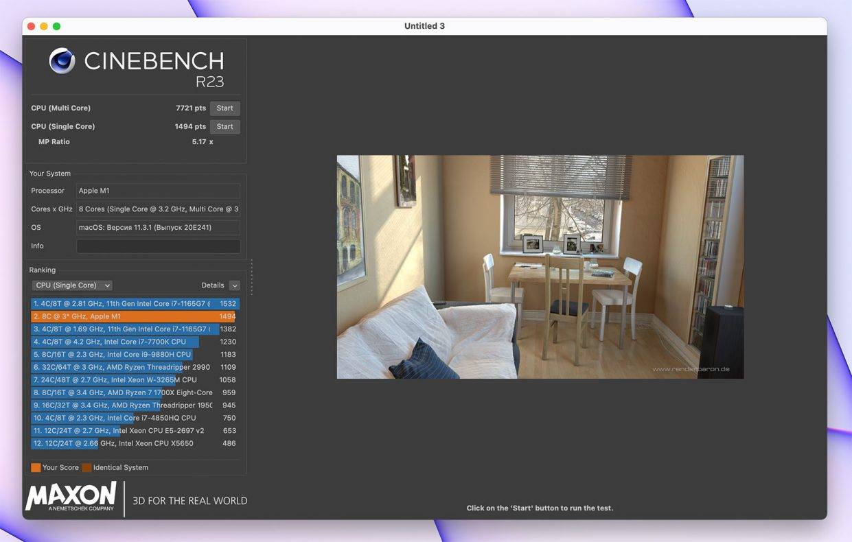 Бенчмарки: скорость чтения и записи памяти (2700+), рендеринг в Cinebench и тест в Geekbench. Результаты соразмерны таковым во всех компьютерах на процессоре M1.