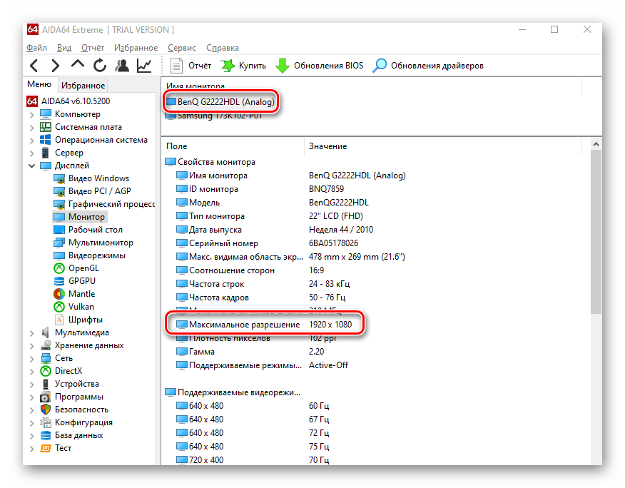 Существует немало приложений, которые считывают информацию обо всем «железе» компьютера или ноутбука, а затем показывают ее в удобном интерфейсе. С помощью подобного ПО можно определить, какое максимальное разрешение поддерживает монитор. Ранее мы публиковали перечень самых эффективных программ такого типа, вы можете ознакомиться с ним и выбрать наиболее понравившуюся. Принцип работы у всех одинаковый.