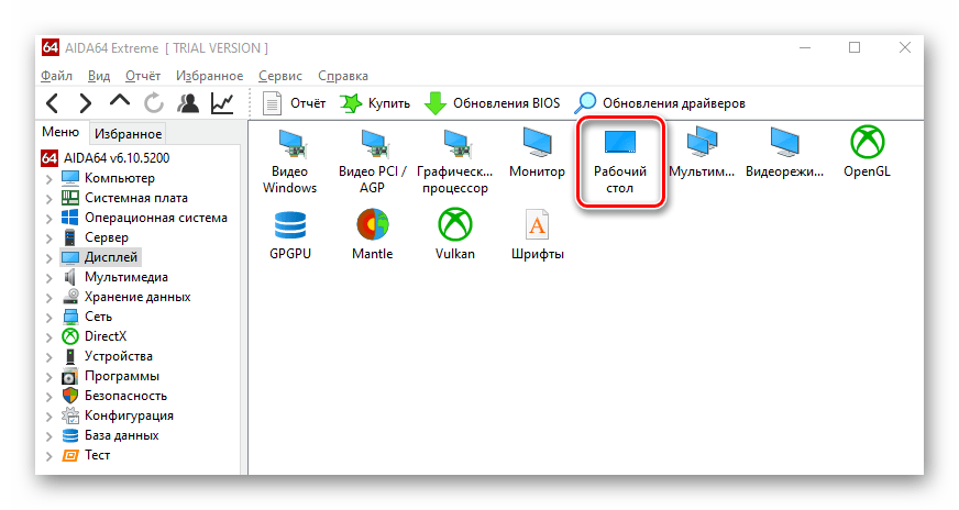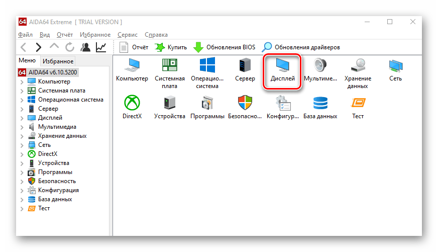 - Запустите приложение AIDA64. В основной части окна кликните левой кнопкой мышки по разделу «Дисплей».
