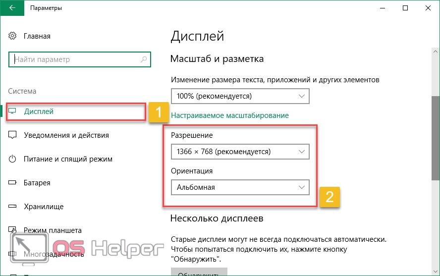 - Откроется новое окно с текущими настройками дисплея. Здесь указывается разрешение, масштаб, ориентация (альбомный, книжный, портретный формат) монитора. Если к ПК подключены другие экраны, то они отобразятся в этом меню. Как и для основного, для них можно указать желаемые параметры, перевернуть.