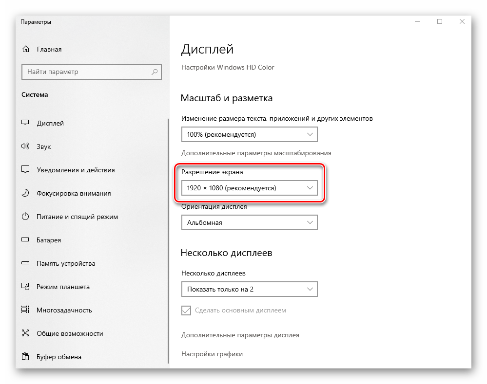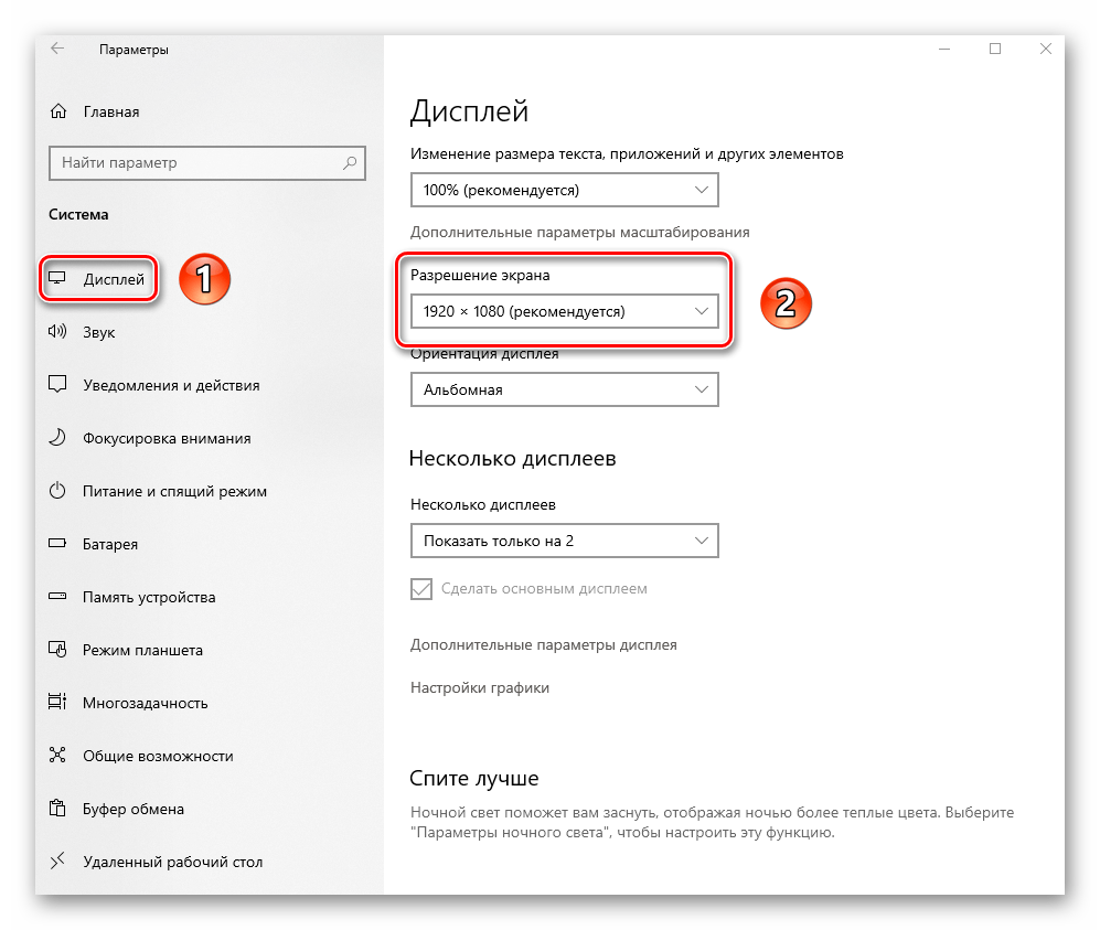 - По умолчанию вы сразу попадете на экран с нужными настройками. Если этого не произошло, то из списка в левой части окна кликните по надписи «Дисплей», чтобы в правой части отобразилось разрешение.